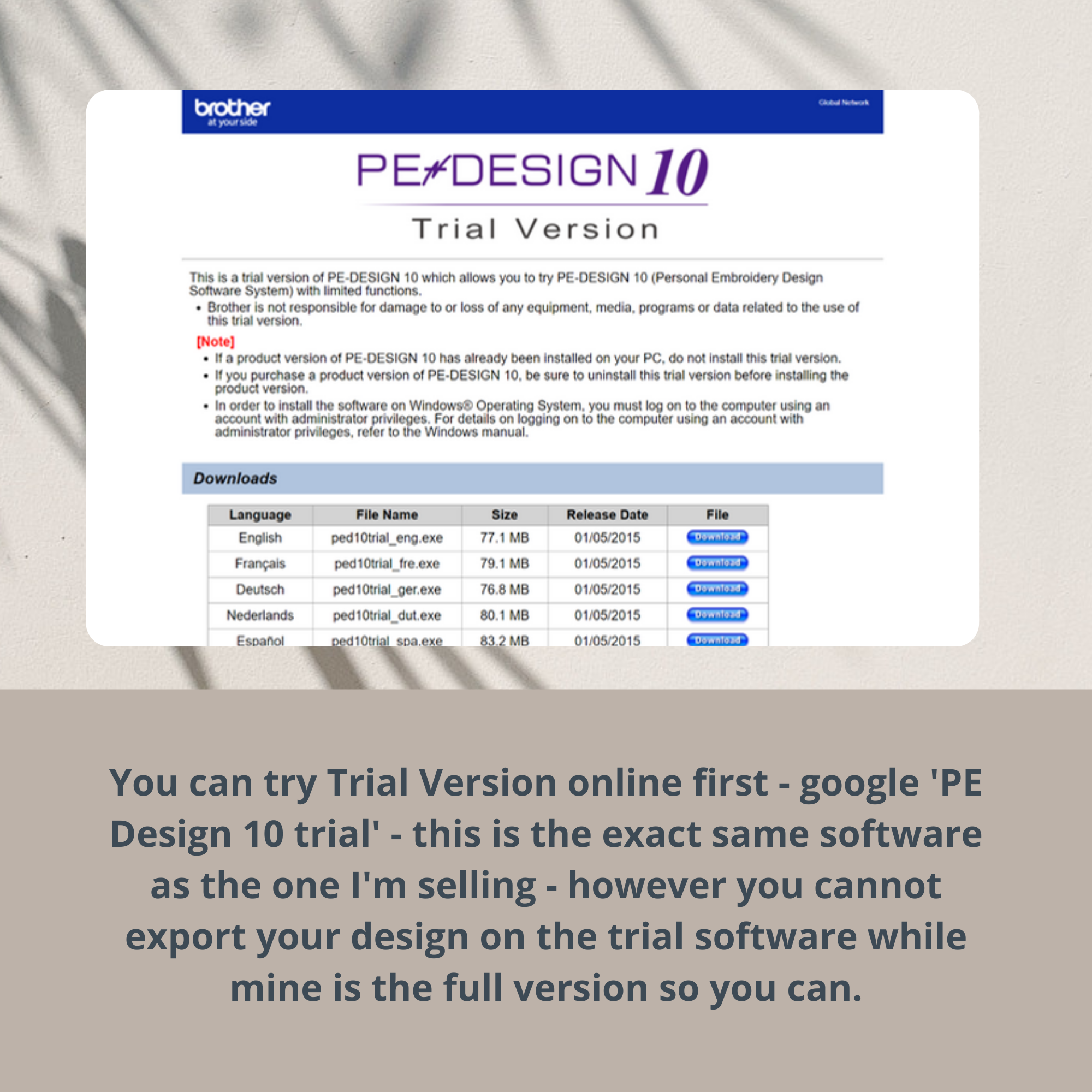 You can try Trial Version online first – google ‘PE Design 10 trial’ – this is the exact same software as the one I’m selling – however you cannot export your design on the trial software while mine is the full version so you can.