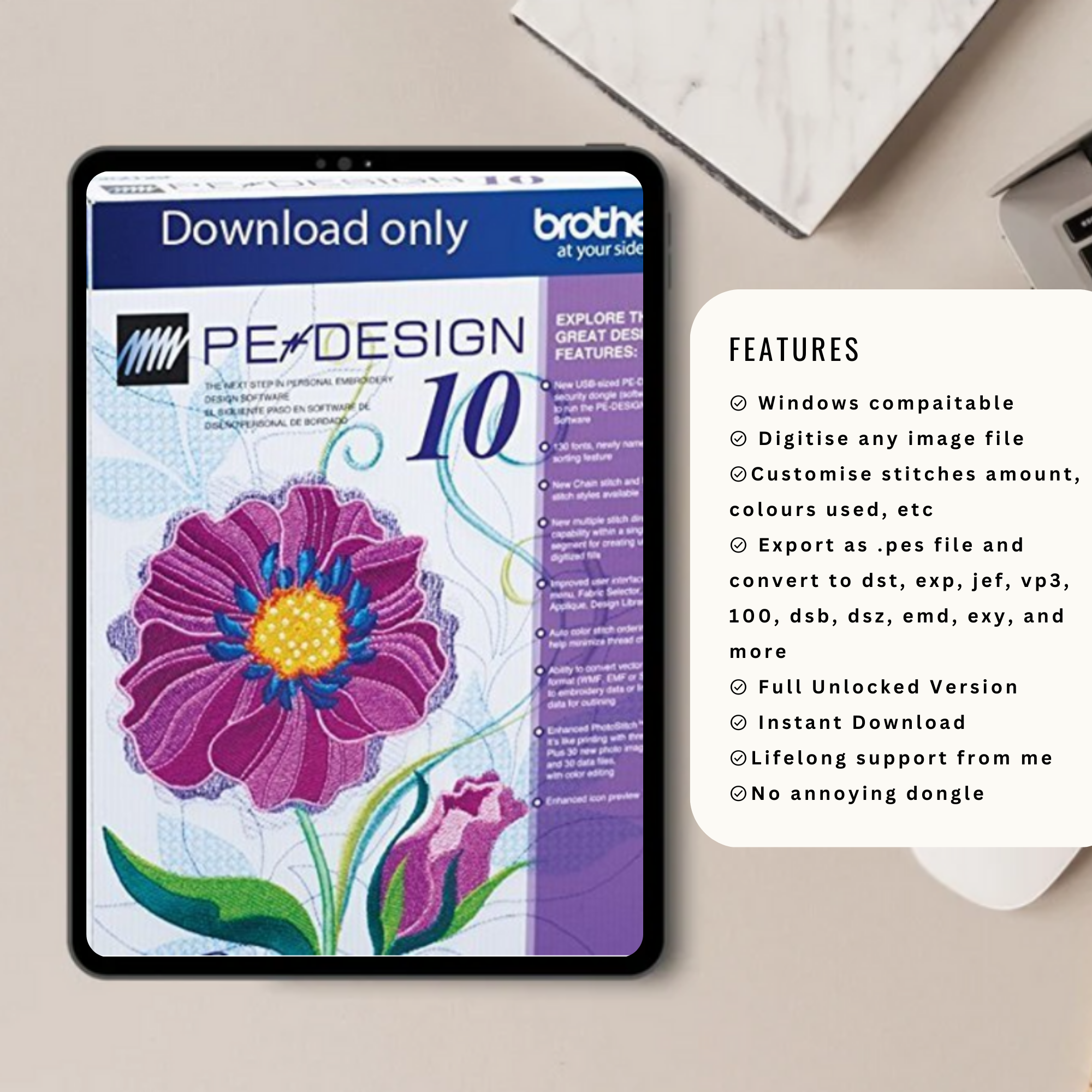 · A genuine Pre-Activated BROTHER PE DESIGN 10 EMBROIDERY FULL SOFTWARE for WINDOWS ONLY + many extra software apps